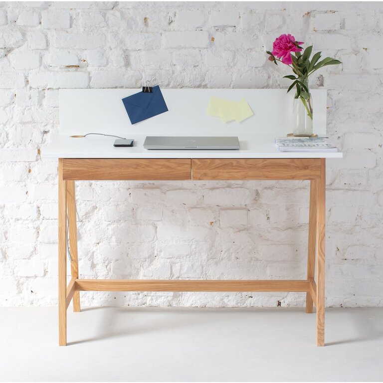 Το γραφείο LUKA έχει όλα όσα χρειάζεστε για να δημιουργήσετε ένα μοντέρνο και καλά οργανωμένο προσωπικό γραφείο στο σπίτι αλλά και έναν όμορφο χώρο μελέτης. Διαθέτει δύο χειροποίητα ξύλινα συρτάρια με αφαιρούμενο πώμα ασφαλείας και υποδοχή διαχείρισης καλωδίων. Η επιφάνεια του τραπεζιού είναι τοποθετημένη σε δύο πόδια σε σχήμα Α που ενώνονται μεταξύ τους με μια εγκάρσια ράγα του υποπόδιου που βοηθά στη μείωση της κόπωσης και στην προώθηση των σωστών θέσεων. Η ορθογώνια επιτραπέζια επιφάνεια είναι εξοπλισμένη με αποσπώμενο πίσω πάνελ που παρέχει μια πρόσθετη επιφάνεια για αυτοκόλλητες σημειώσεις ή αγαπημένες φωτογραφίες.