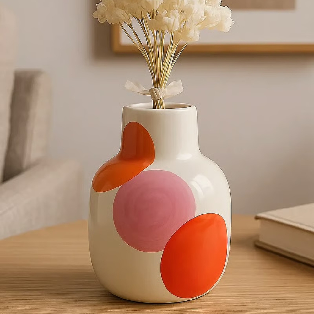Ανανεώστε τον χώρο σας με αυτό το μοναδικό κεραμικό βάζο, που συνδυάζει μίνιμαλ αισθητική και σύγχρονο design. Το απαλό εκρού φόντο «σπάει» αρμονικά από γεωμετρικά σχήματα σε ζεστές αποχρώσεις κόκκινου και ροζ, δημιουργώντας ένα καλλιτεχνικό αποτέλεσμα που τραβάει το βλέμμα χωρίς να κουράζει.